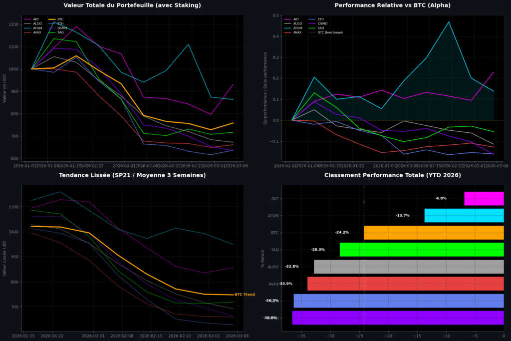 The data reveals a generalized correction phase since late January, but some networks are clearly proving more resilient than others. AKT stands out as the most resilient asset so far, while ATOM maintains a solid second position ahead of Bitcoin.
